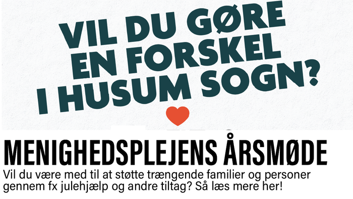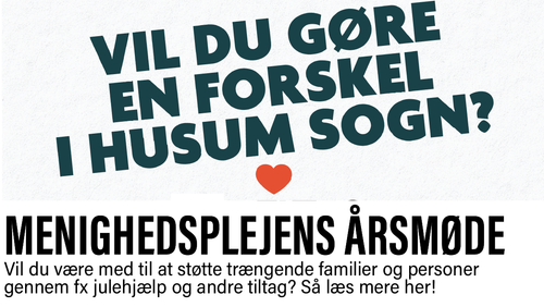 Vil du være med til at gøre en forskel for trængende borgere i Husum Sogn? Det kan du i Husum Kirkes menighedspleje, hvor vi uddeler økonomisk støtte som fx akuthjælp, julehjælp og julegaver til børn. Kom og høre mere til vores årsmøde søndag den 19. april kl. 12, efter højmessens kirkekaffe, i menighedssalen.