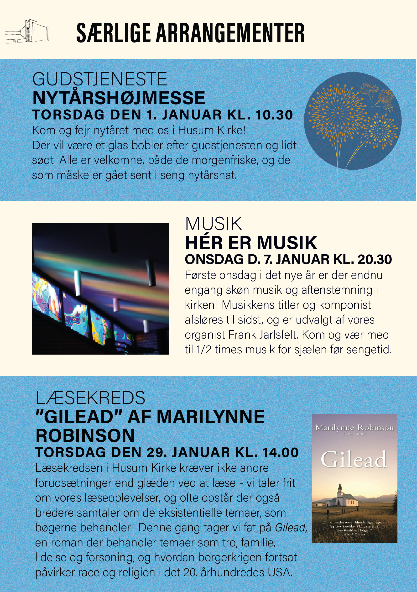 Januarprogram i Husum Kirke 2026, særlige arrangementer, nytårsgudstjeneste 1. januar, Hér er musik 7. januar, læsekreds 29. januar -