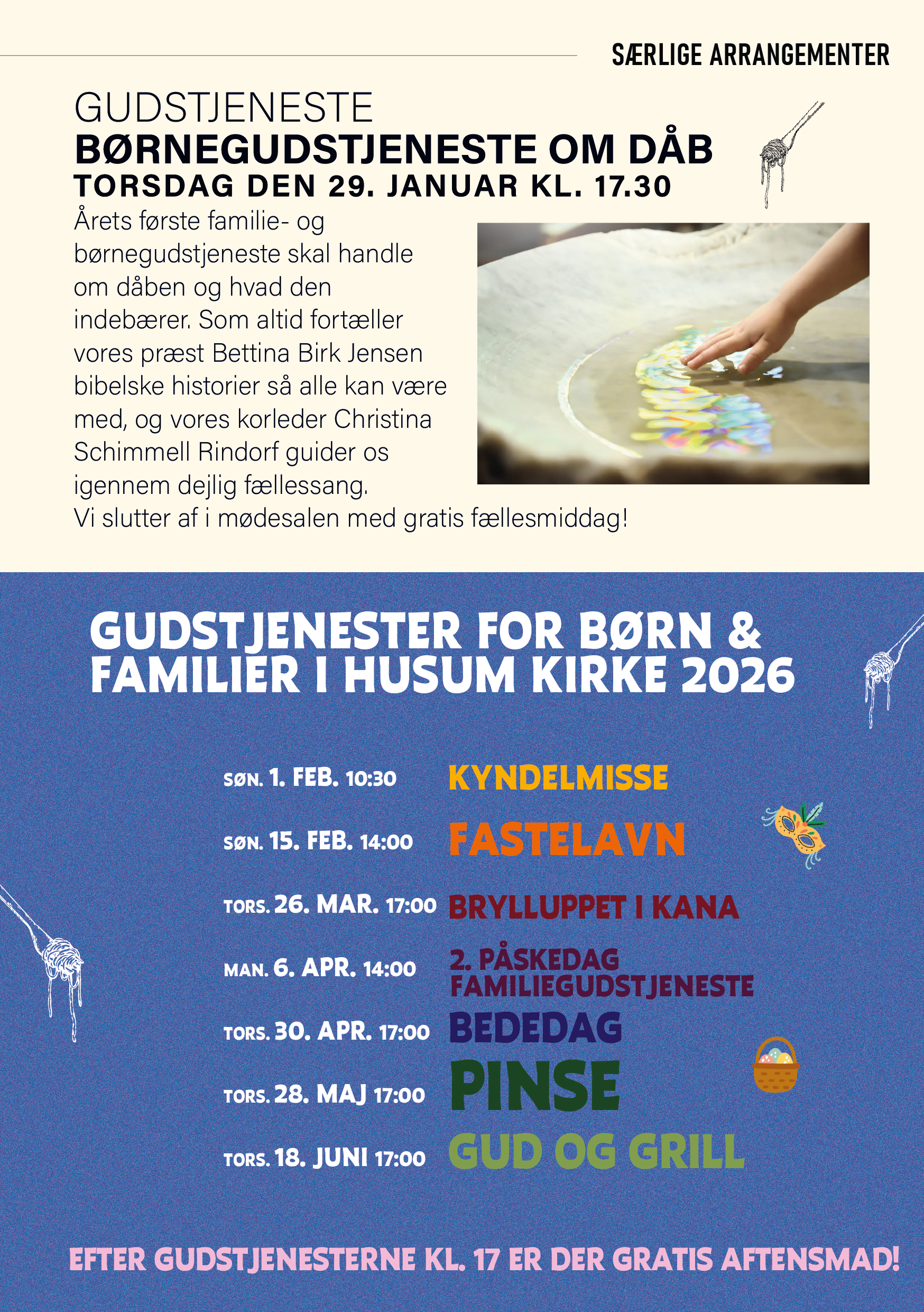 Januarprogram i Husum Kirke 2026, særlige arrangementer, børnegudstjeneste familiegudstjeneste 29. januar, oversigt over vinter og forårs børne- og familiegudstjenester -