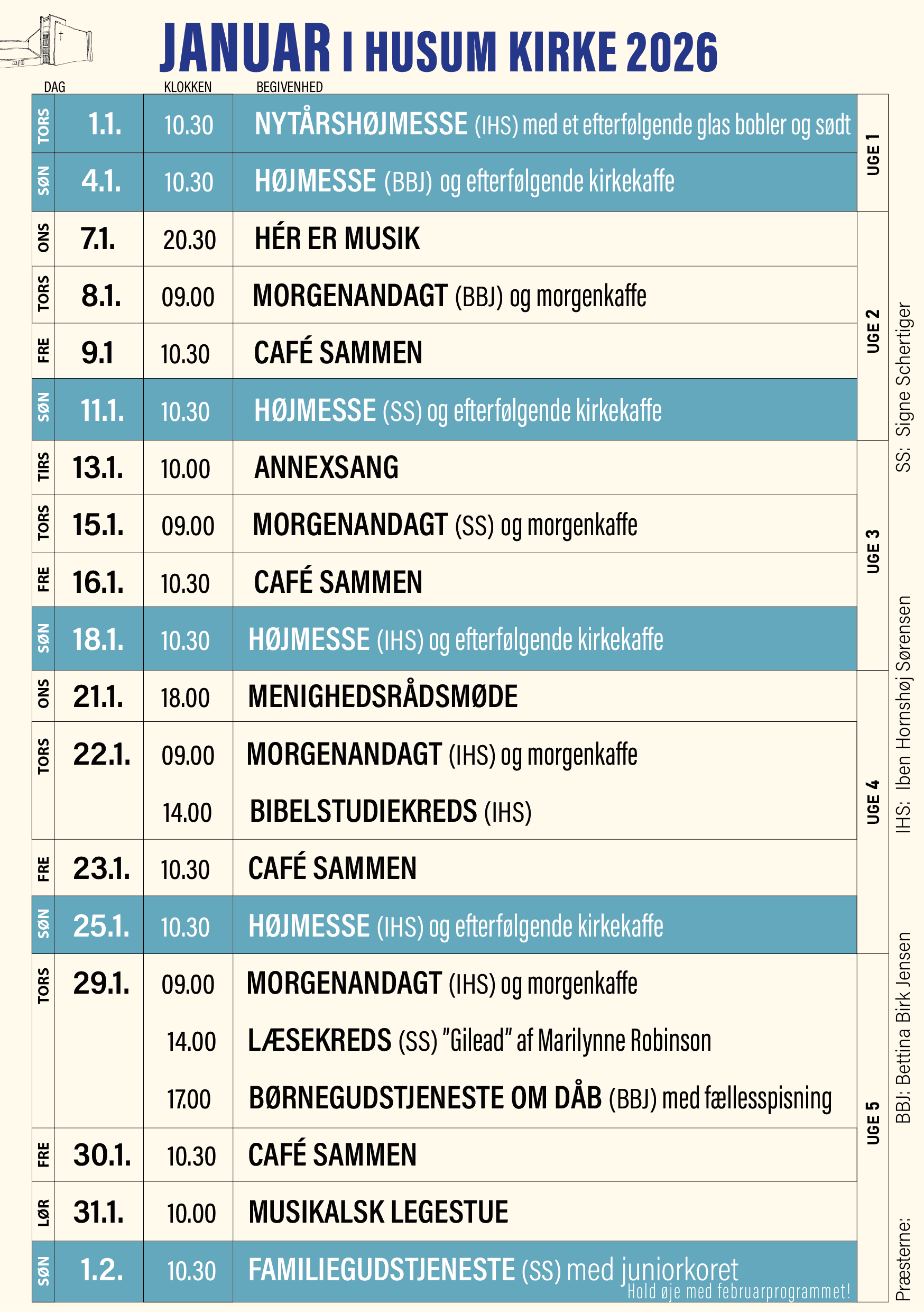 Januarprogram i Husum Kirke 2026, kalenderoversigt -
