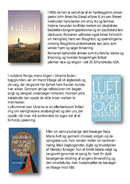 Bøgerne til læsning er tilgængelige på biblioteket. Både som fysisk bog og via www.ereolen.dk som ebog og lydbog.